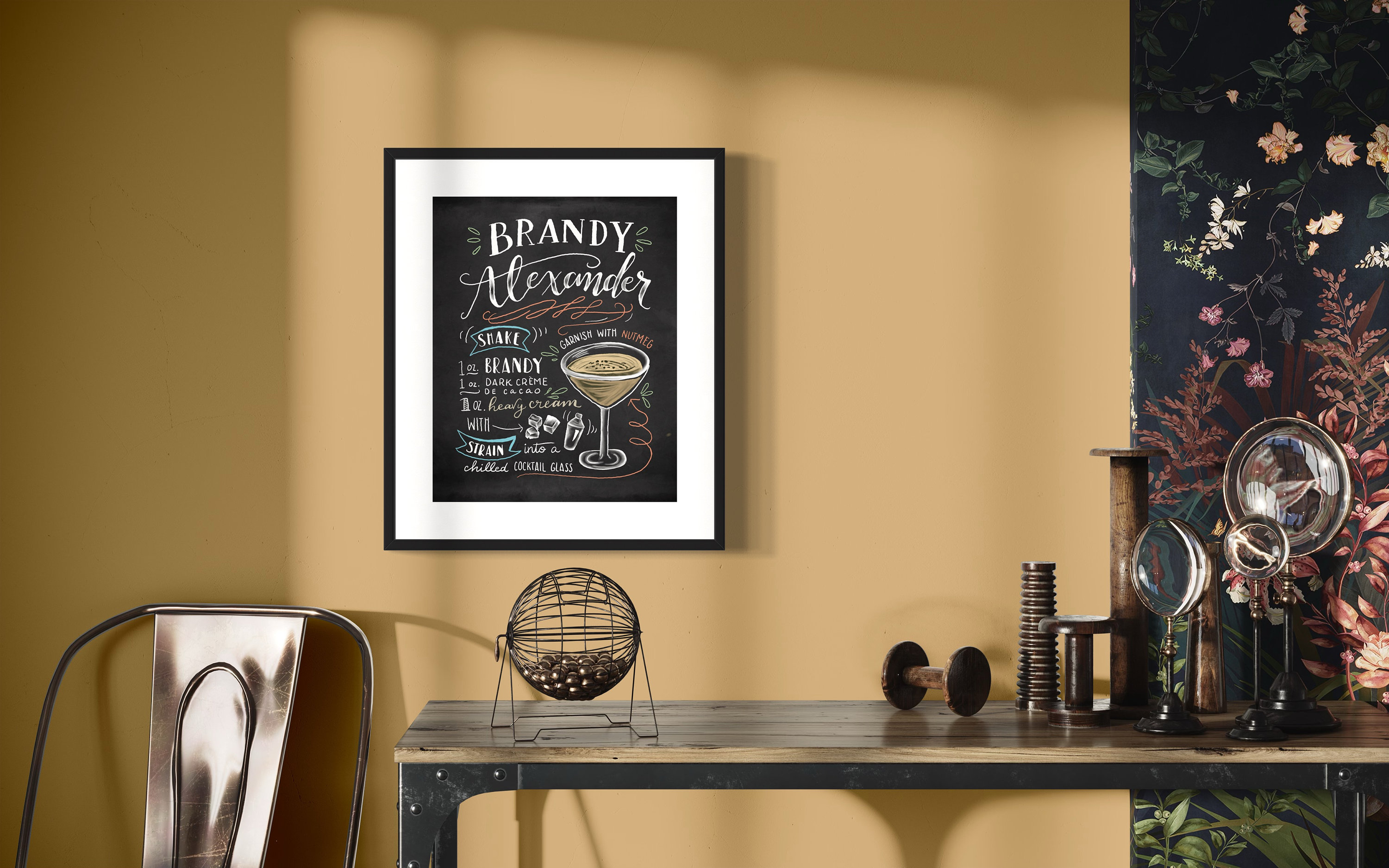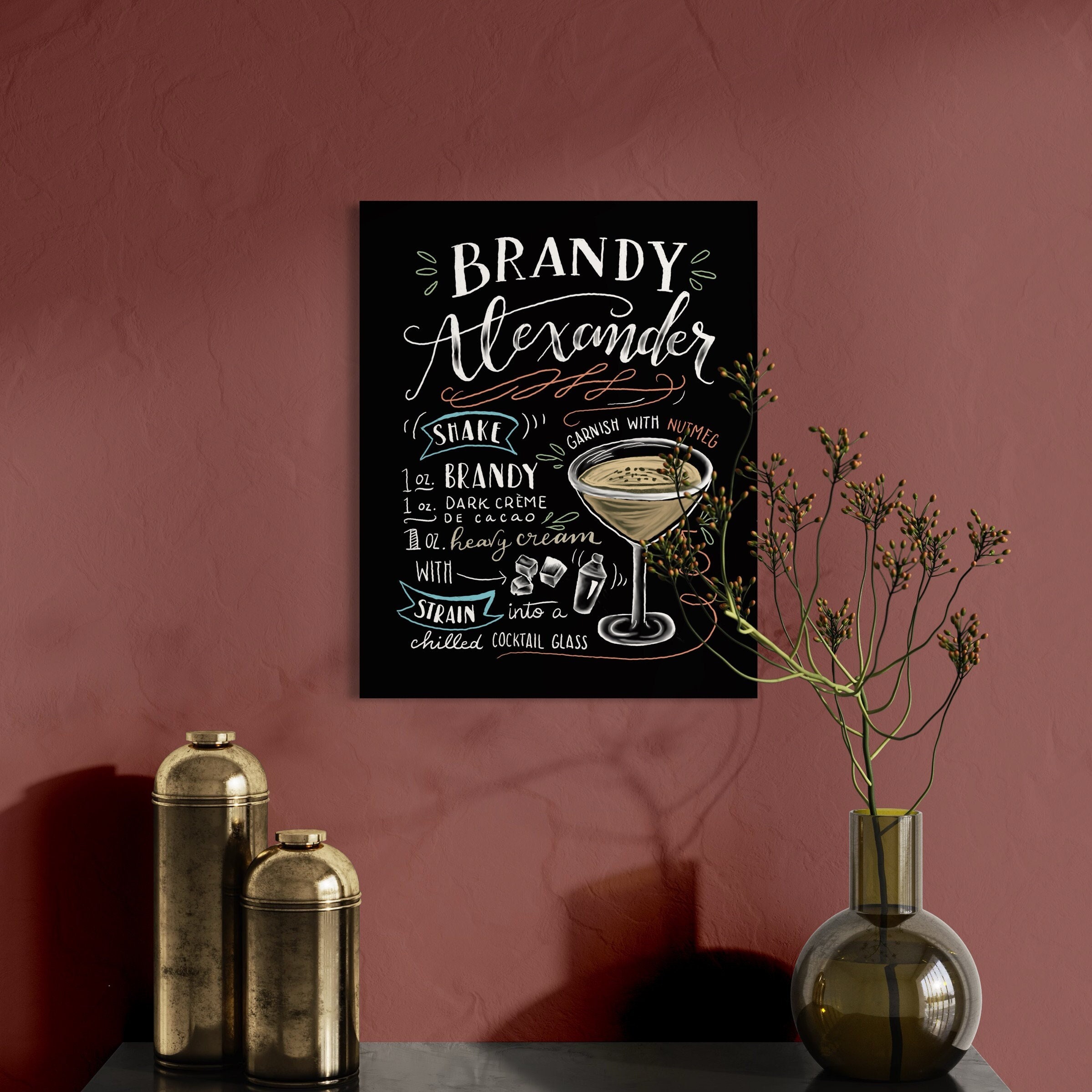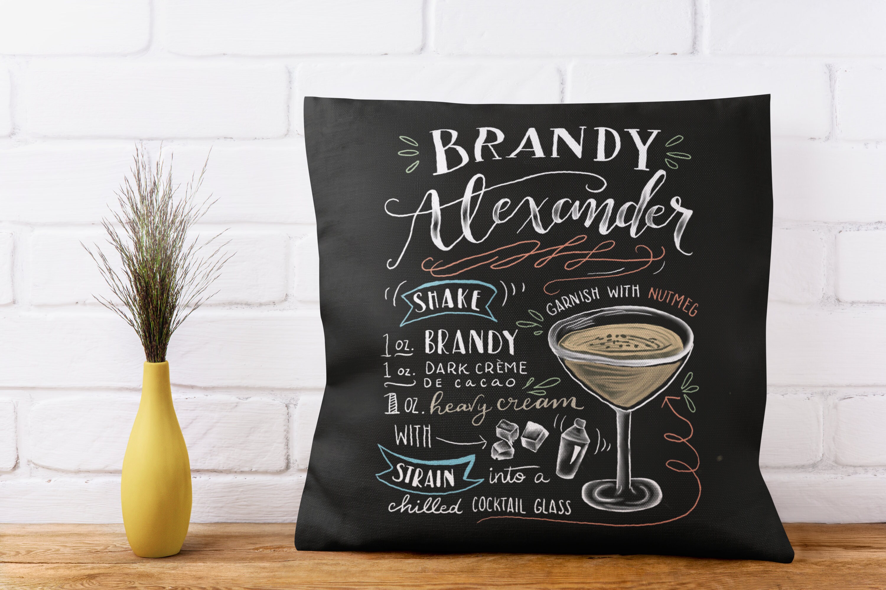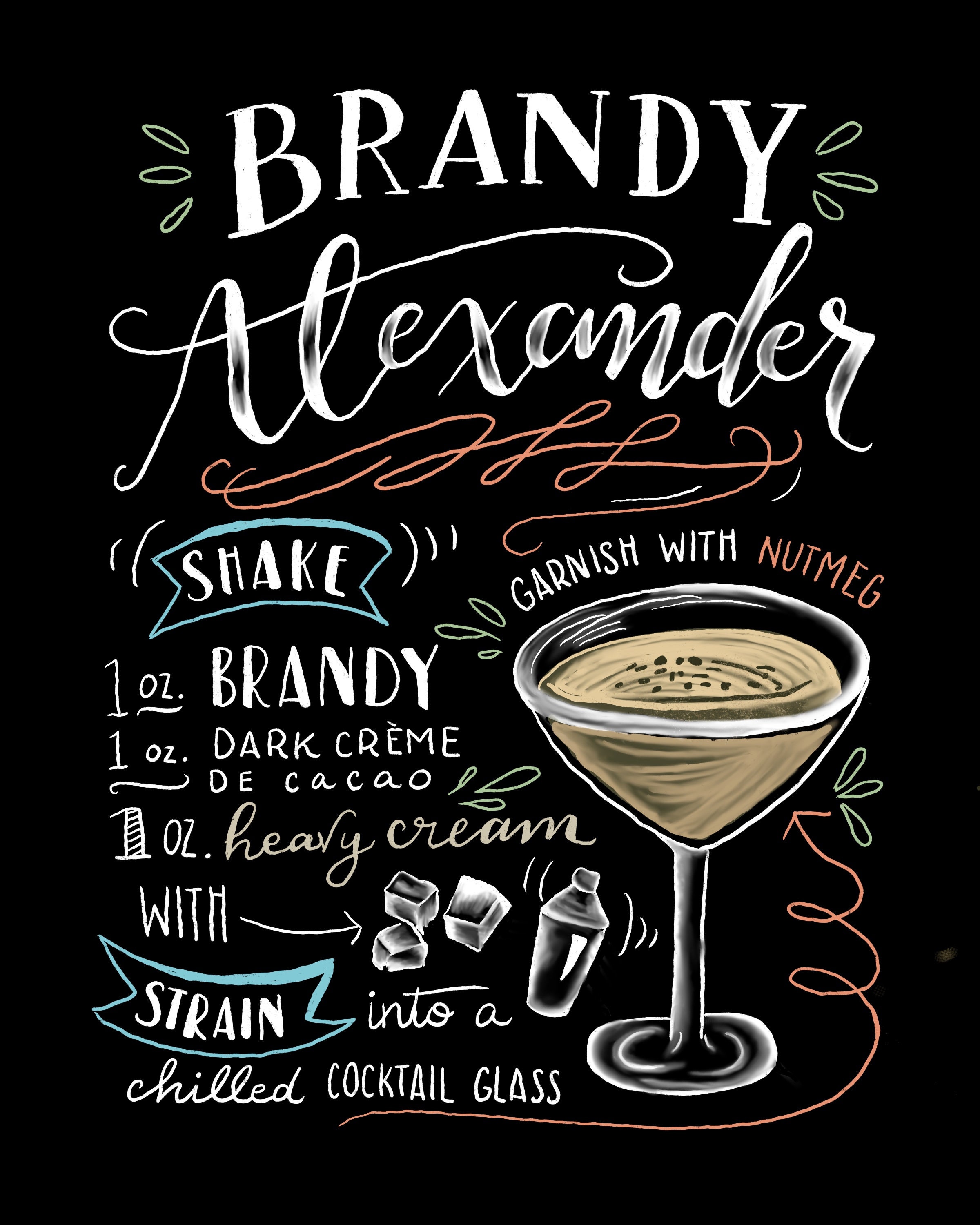 • Hand drawn Brandy Alexander cocktail recipe sign printable bundle • Sized 8”x10” and easily resizable 16” x 20” and 24”x30” • Includes .jpg file for canvas, photo, poster prints and more • Also includes .png file for printing on bags, mugs, t-shirts, pillows, blankets, notecards, and postcards and more