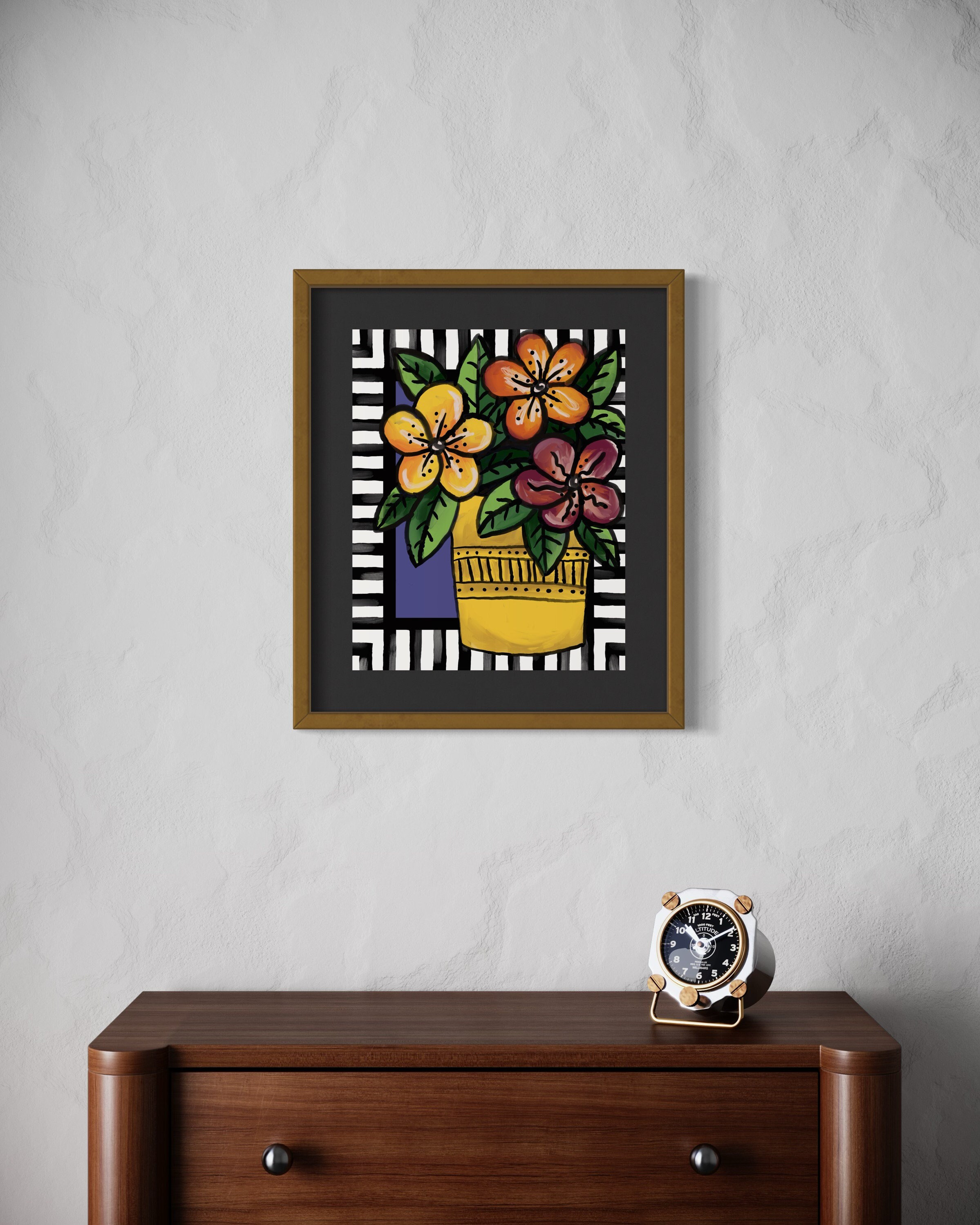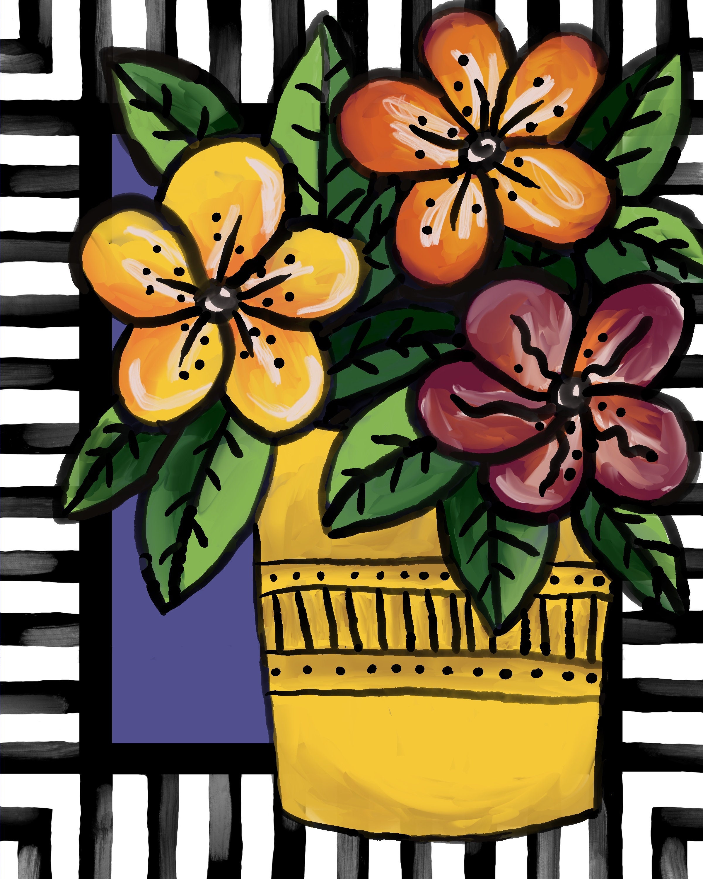 Whimsical Purple Yellow Orange African Daisy in Pot with Border Floral Printable