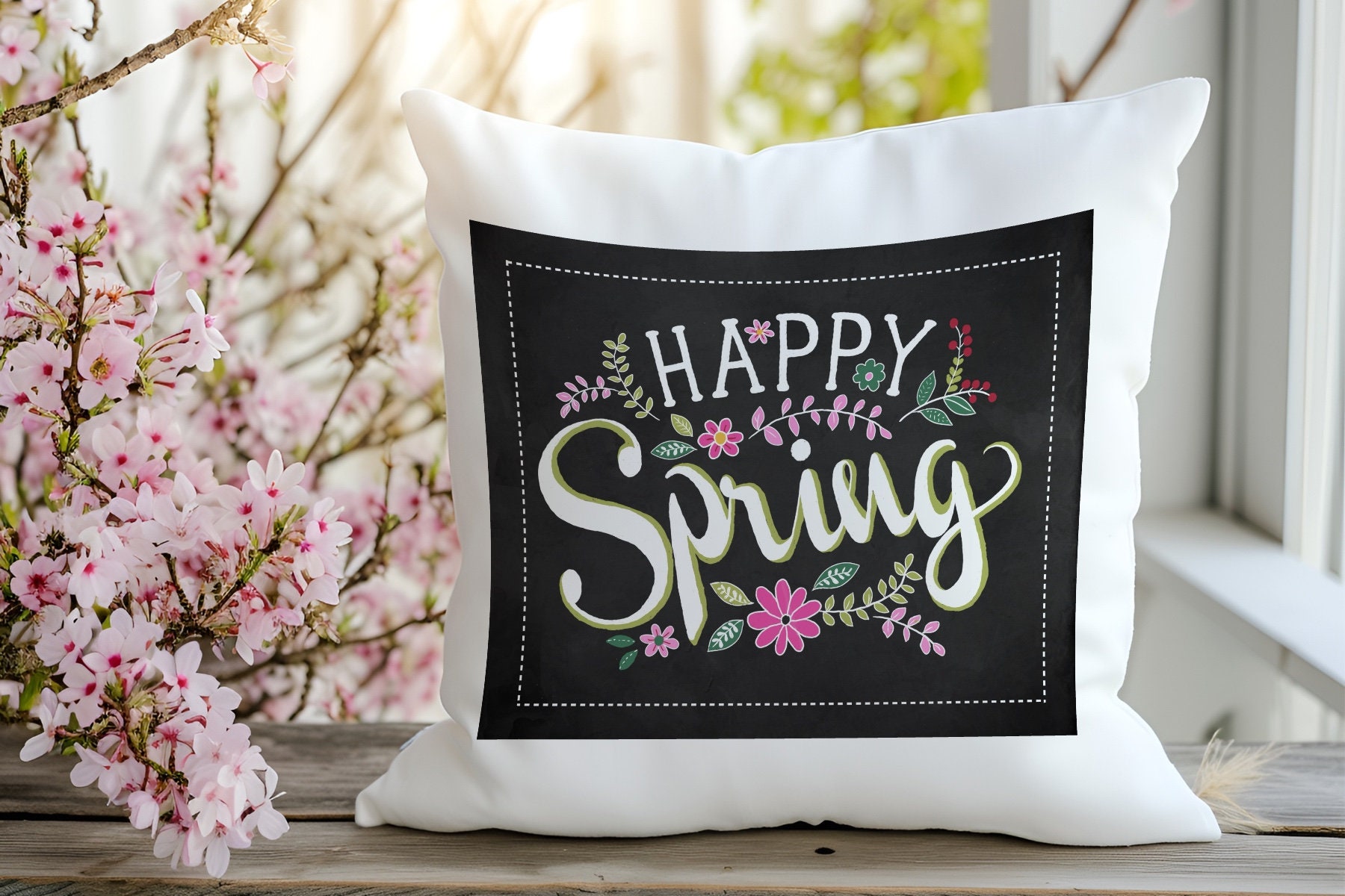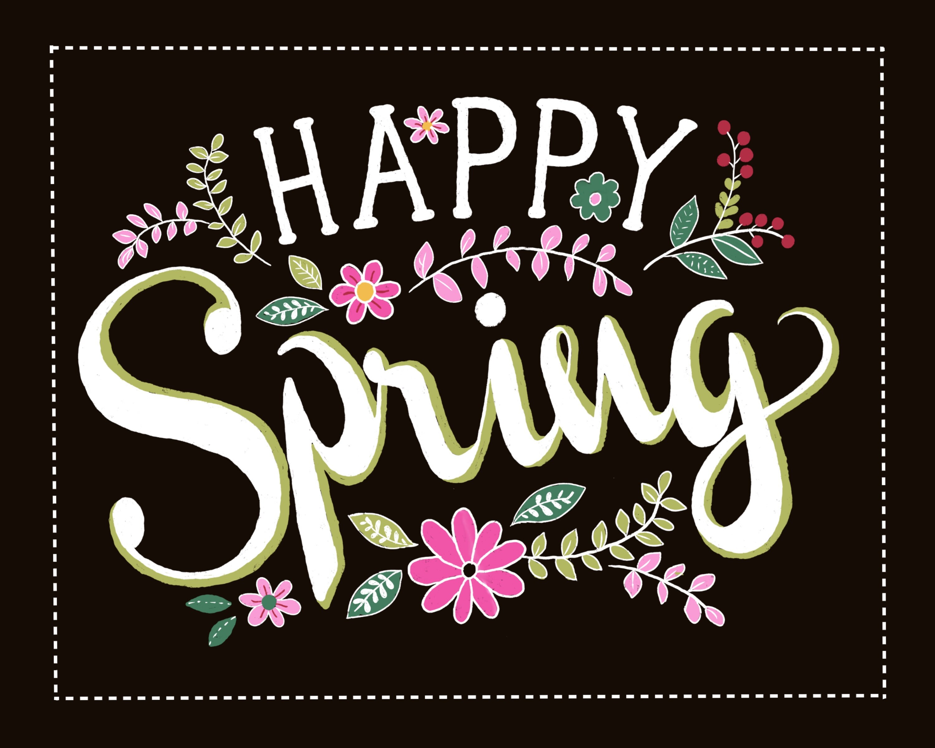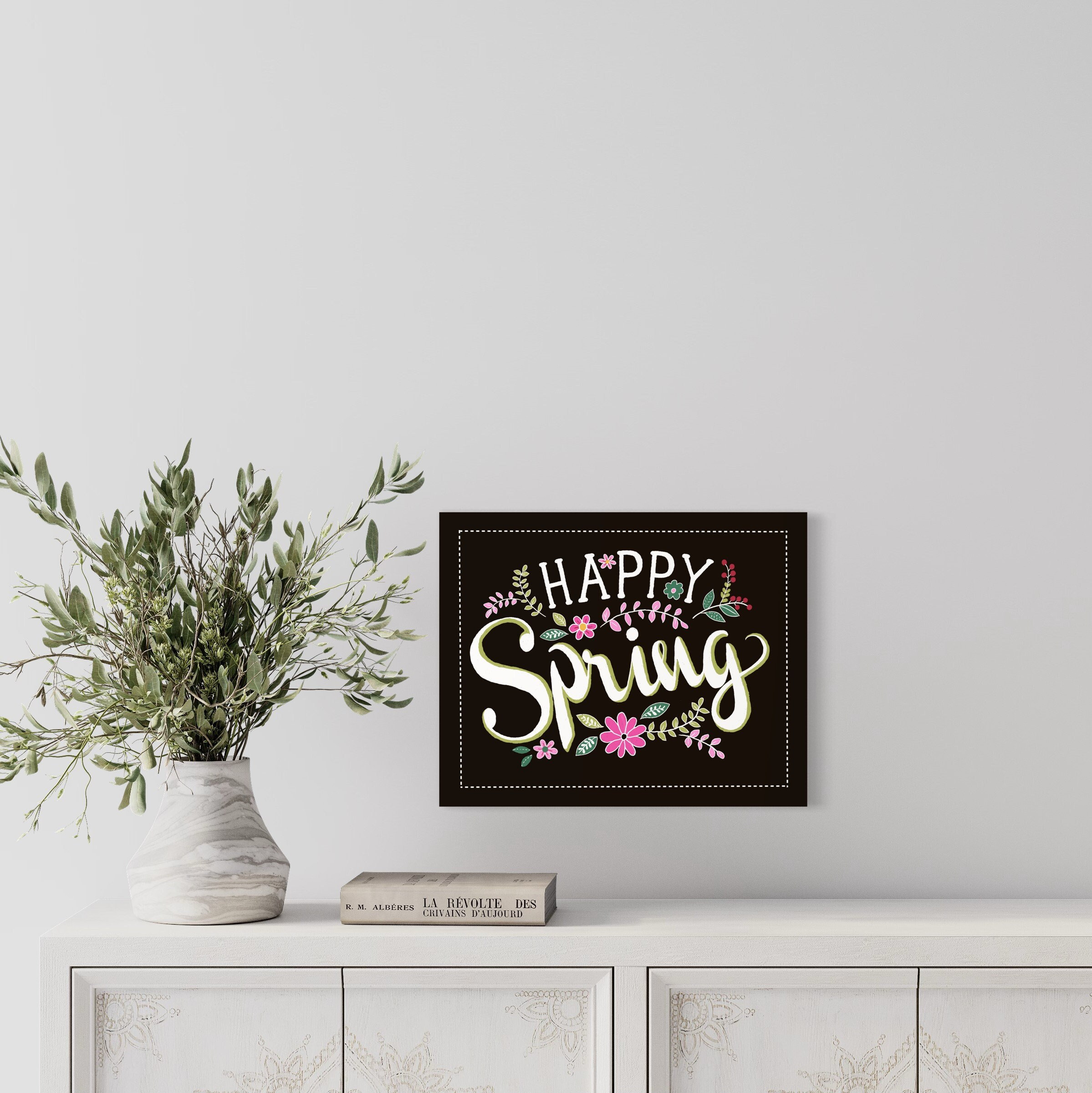 - Hand drawn chalk Happy Spring printable with leaves, berries, and flower accents on a black background - Sized at 10” x 8” and easily resized to 20” x 16” and 30” x 24” - Includes .jpg file for canvas, photo, poster prints, and more - Also includes .png file for printing on bags, mugs, t-shirts, pillows, blankets, notecards, and postcards