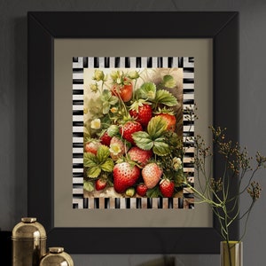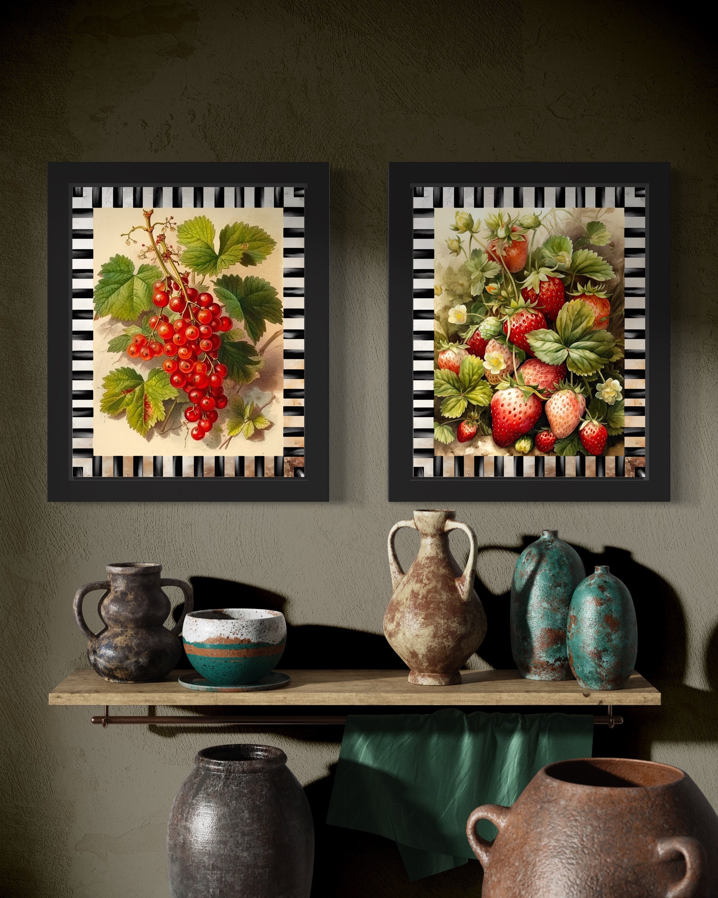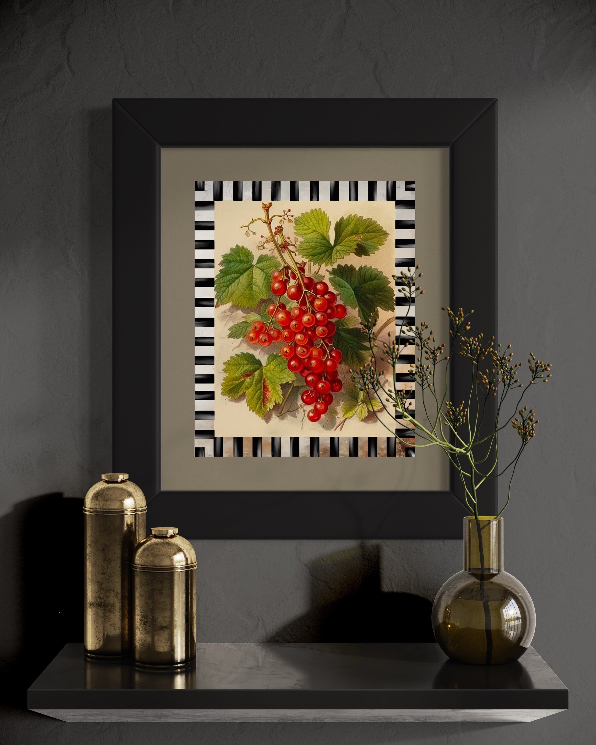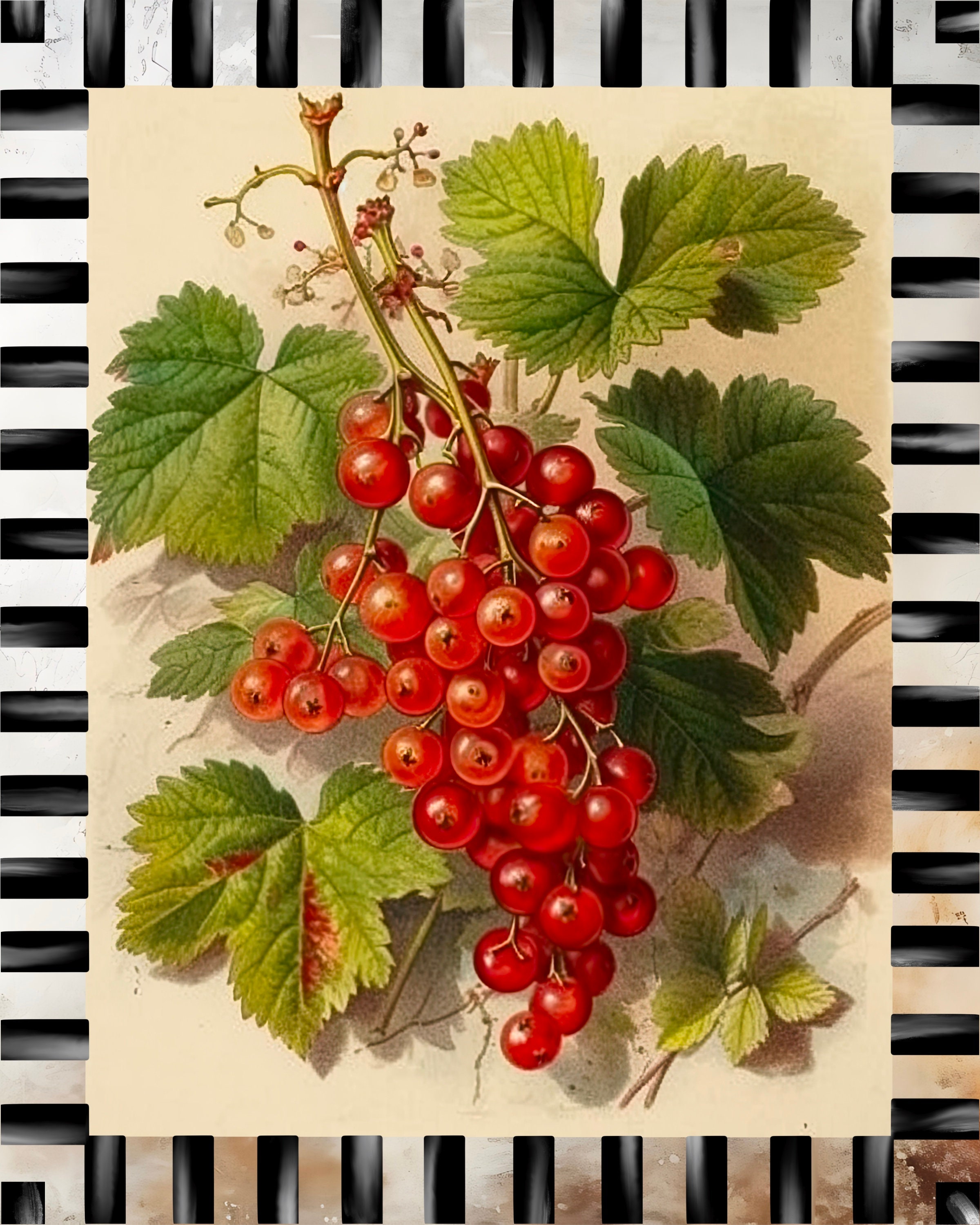 Welcome to our Red Currant Vintage Botanical Printable with a charming twist - a bold black and white antiqued striped border! This unique design adds a touch of sophistication to any space, making it the perfect addition to your home decor collection.