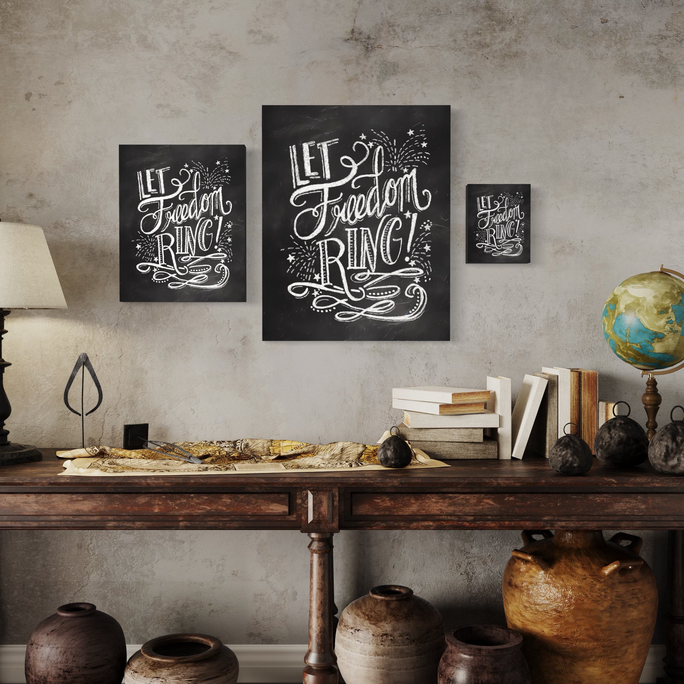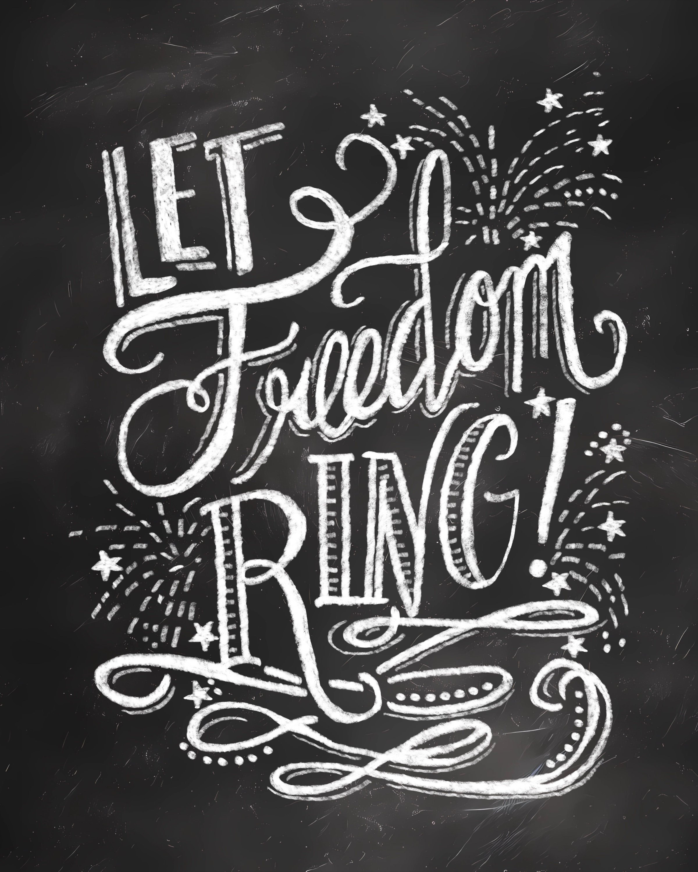 This bundle includes: - Hand drawn Chalkboard Let Freedom Ring digital art bundle - Available in 8” x 10” portrait size, but can be enlarged to 16” x 20” up to 24” x 30” - File formats include .jpg for wall and display art on canvas, and .png files (in black or white) for mugs, pillows, totes, t-shirts, cards, and more