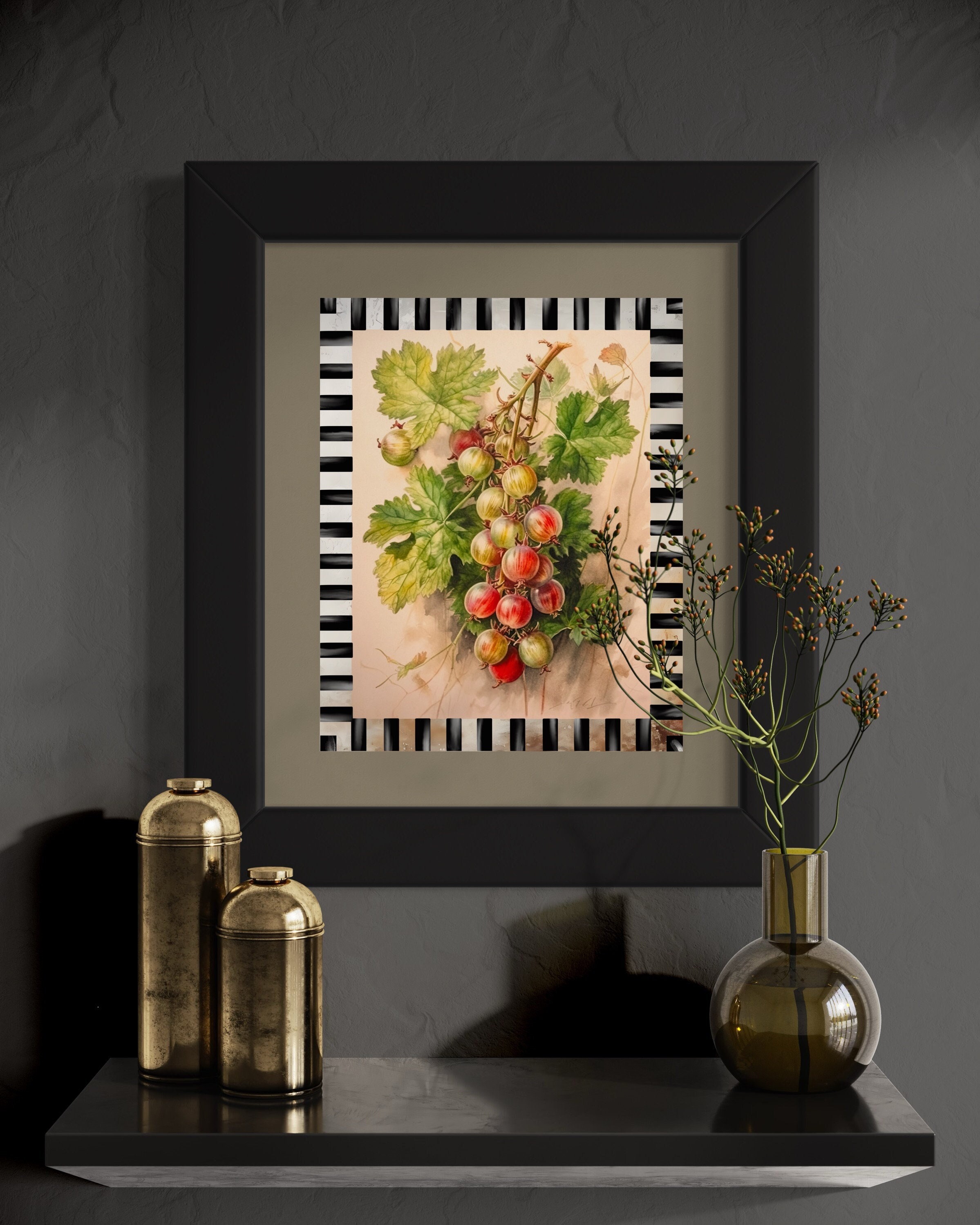 Welcome to the beautiful world of Gooseberries Vintage Botanical Printables with a Black and White Antiqued Striped Border. This stunning piece will add a touch of timeless elegance to any space.