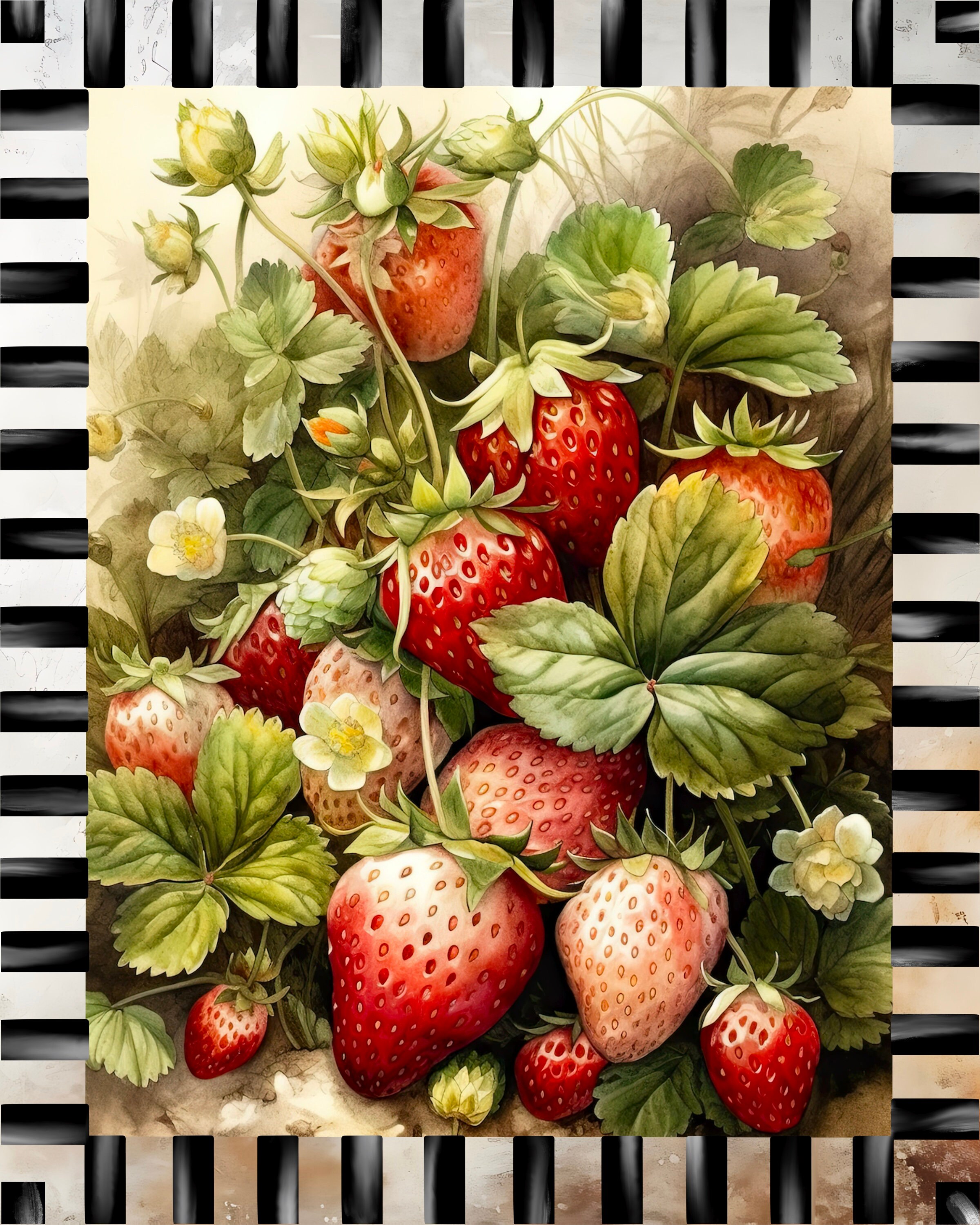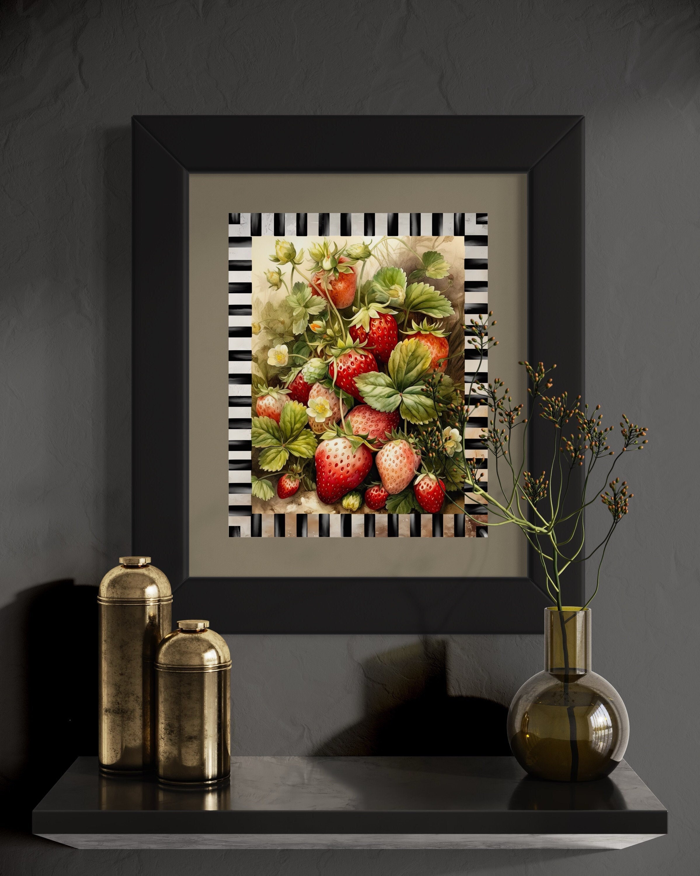 Introducing our Strawberries Vintage Botanical Printable with a twist - a sleek black and white antiqued striped border! This unique print will add a touch of elegance to any space, making it the perfect addition to your home decor.