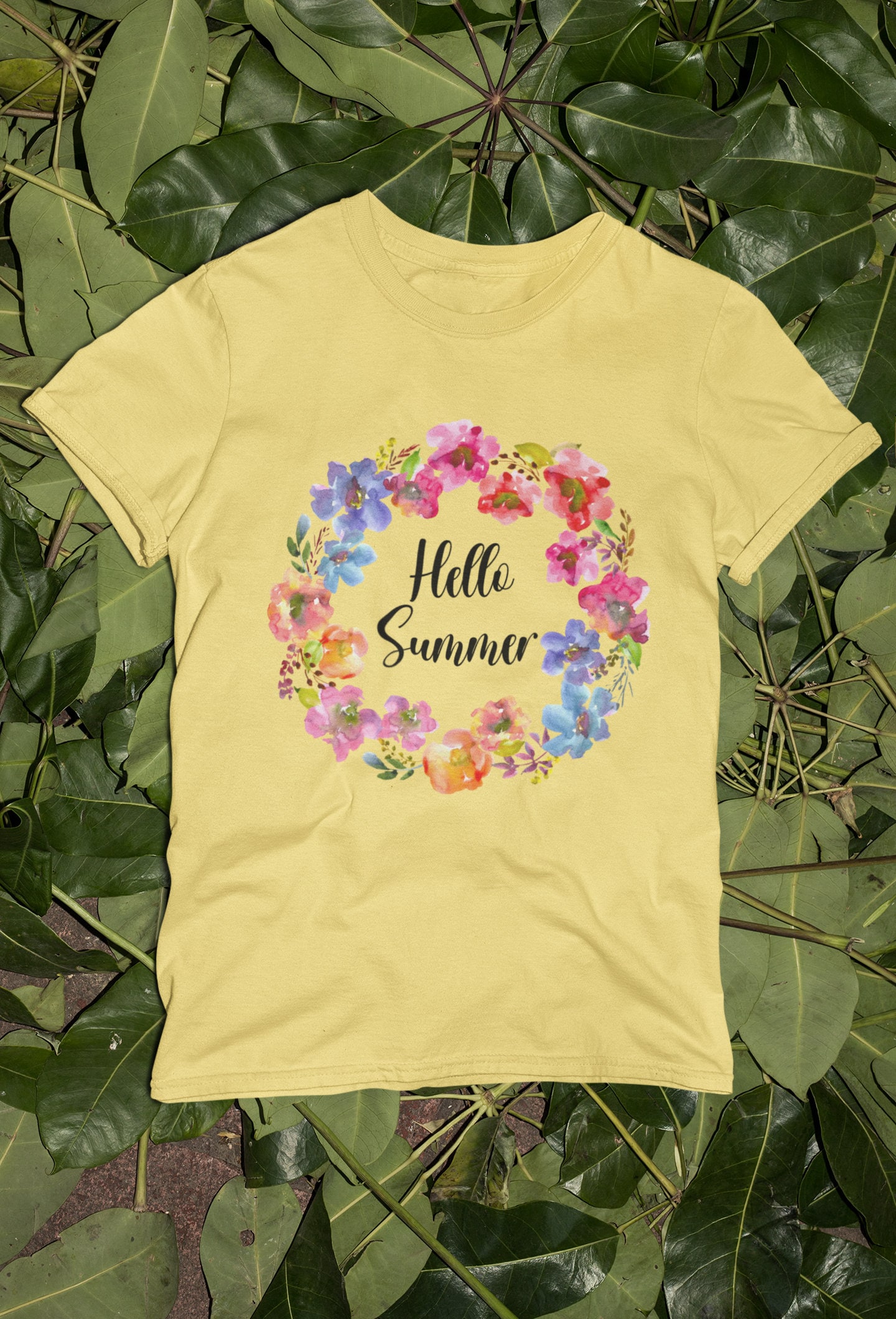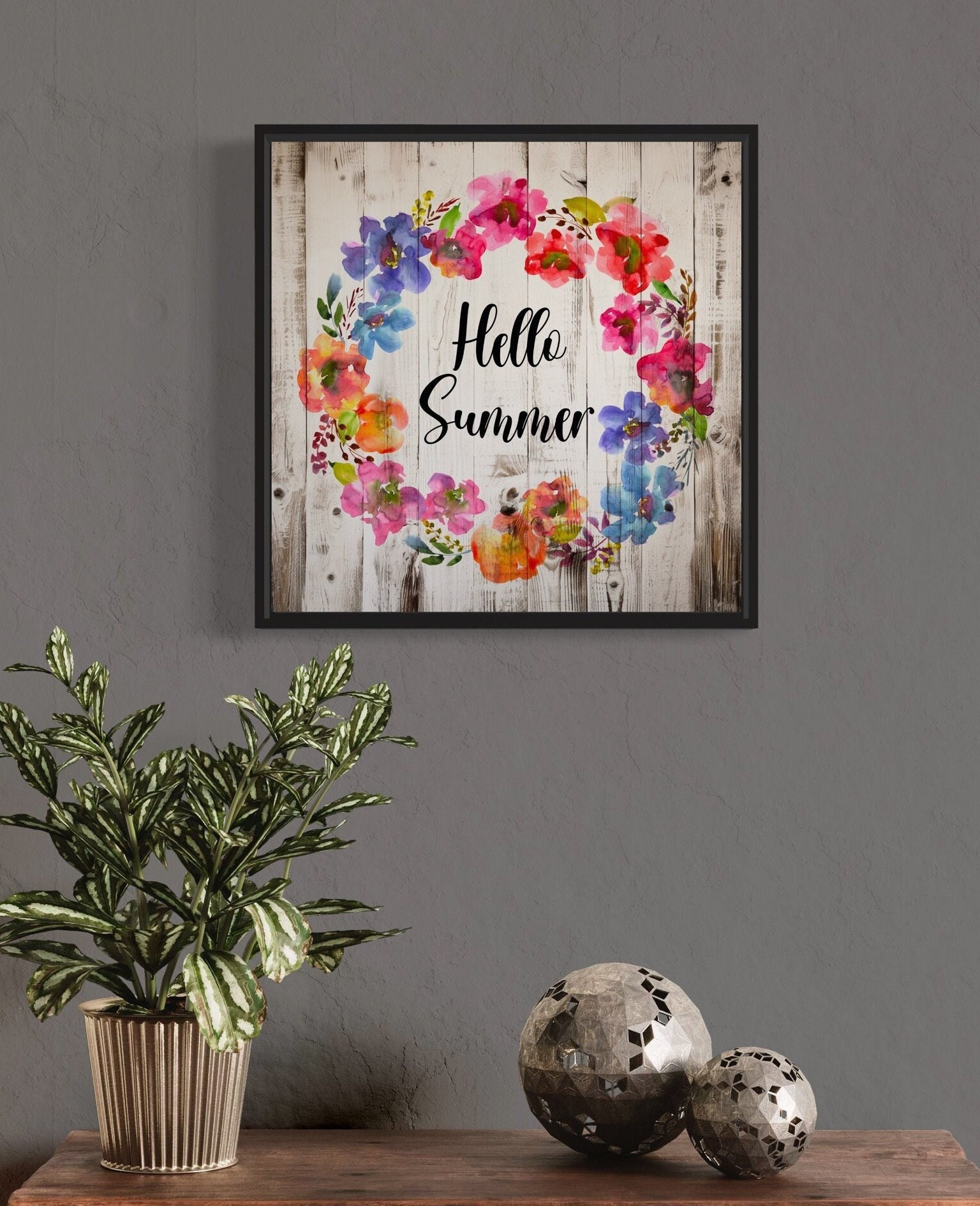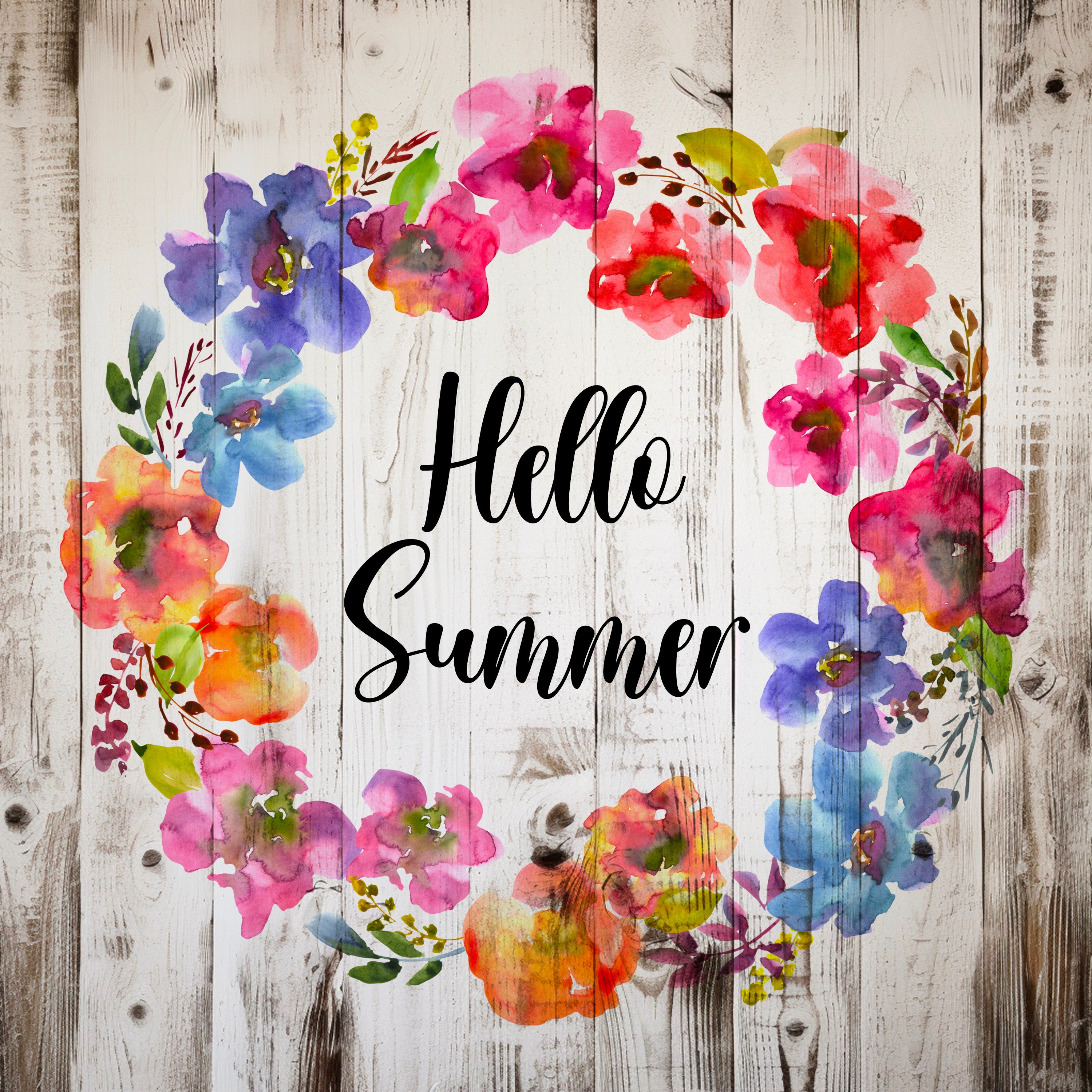 • Hand painted Hello Summer watercolor wreath on distressed wood background • Sized 10”x10” and easily resizable to 16” x 16” and 20”x20” • Includes .jpg file for canvas, photo, poster prints and more • Also includes .png file for printing on bags, mugs, t-shirts, pillows, blankets, notecards, and postcards and more