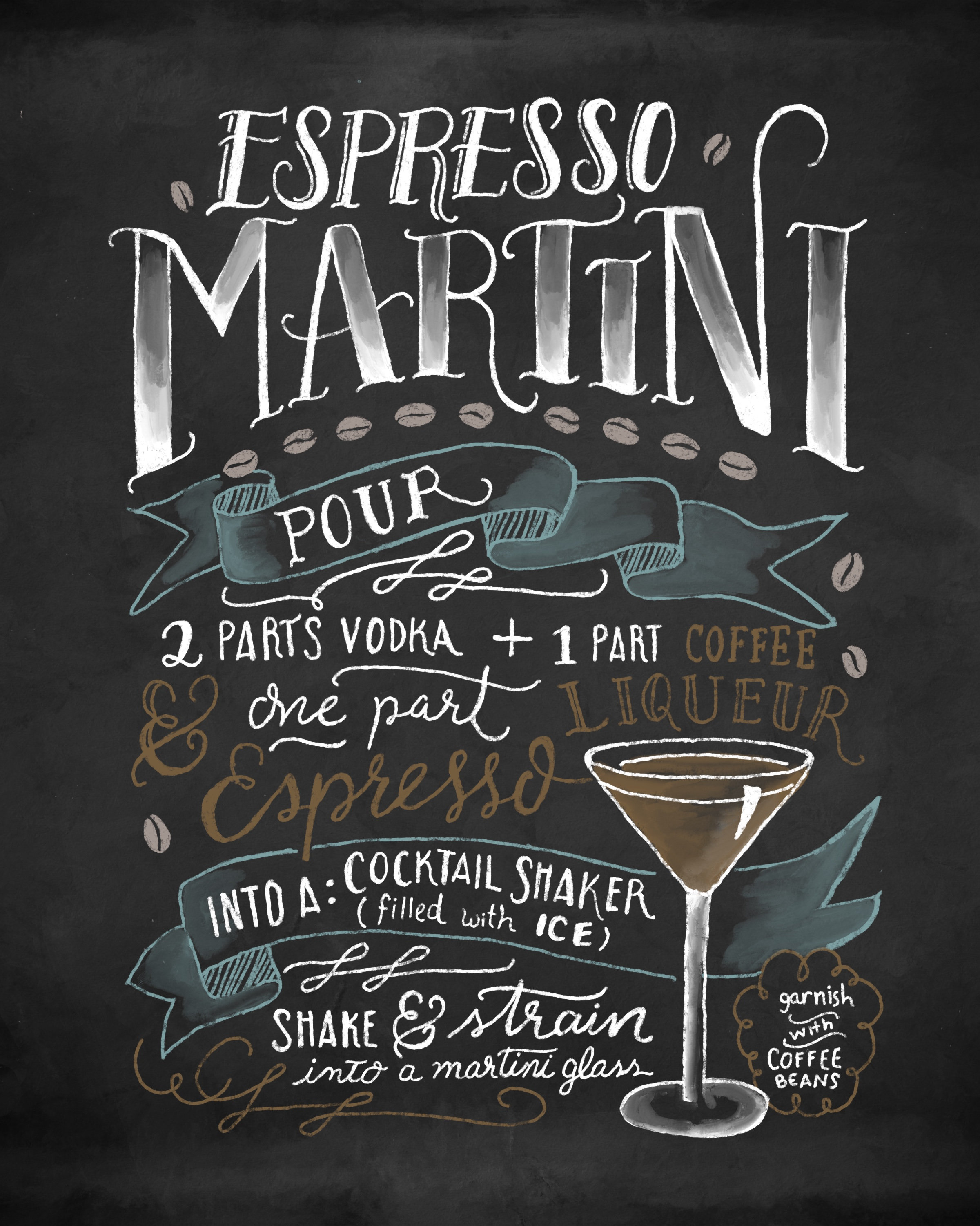 • Hand drawn Espresso Martini cocktail recipe sign printable bundle • Sized 8”x10” and easily resizable 16” x 20” and 24”x30” • Includes .jpg file for canvas, photo, poster prints and more • Also includes .png file for printing on bags, mugs, t-shirts, pillows, blankets, notecards, and postcards and more